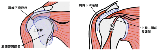 肩関節の動きをよくする袋(肩峰下滑液包)や関節を包む袋(関節包)が癒着するとさらに動きが悪くなります(拘縮または凍結肩)。
