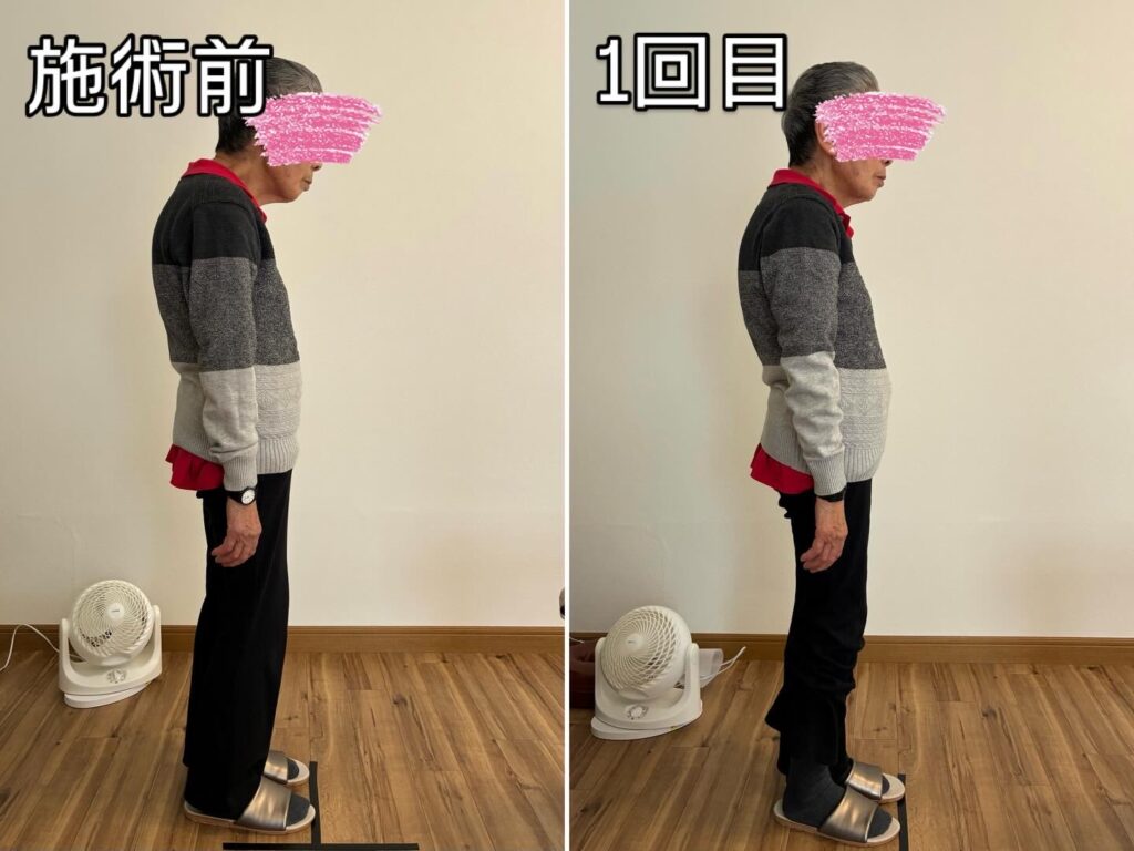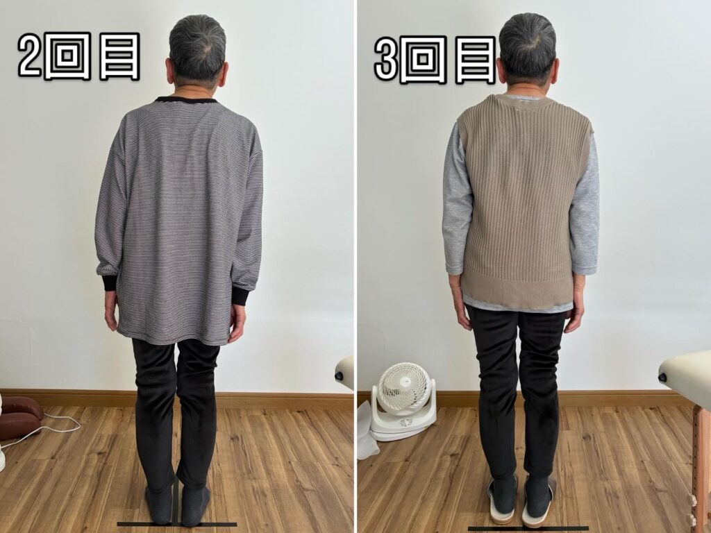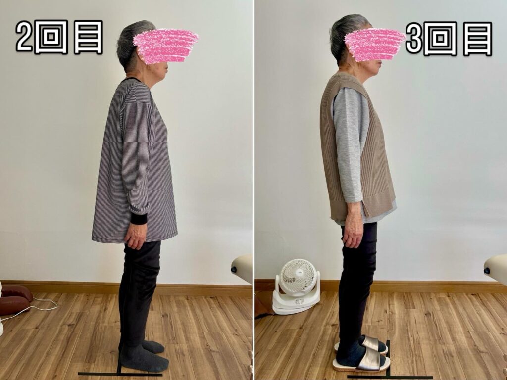 2回目ですでに丸まった猫背は改善されましたが、3回目で姿勢がより安定してきました。