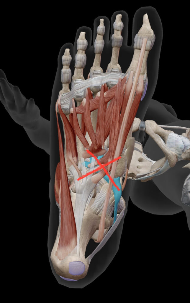 赤いバツ印のあたりで腓骨筋と後脛骨筋がクロスしています。