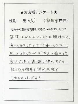 なみのり整体の筋膜整体は、強く押したりバキバキ鳴らしたりしません。 筋膜をしっかり捉えて体の深部にアプローチ、本来のしなやかな動きを取り戻していきます。 痛みの原因は肩にあるとは限りません。 延べ4万人以上を施術してきたベテラン整体師が痛みの原因を突き止め改善に導いていきます。 何をしても良くならなかった方ほど、ぜひ一度体験してみてください。 きっと「今までと違う」と感じていただけるはずです。
