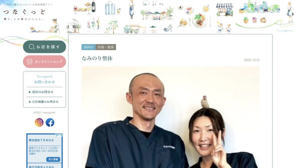 地域情報サイト「つなぐっど」様に、静岡市の整体院として当院をご紹介していただきました。
